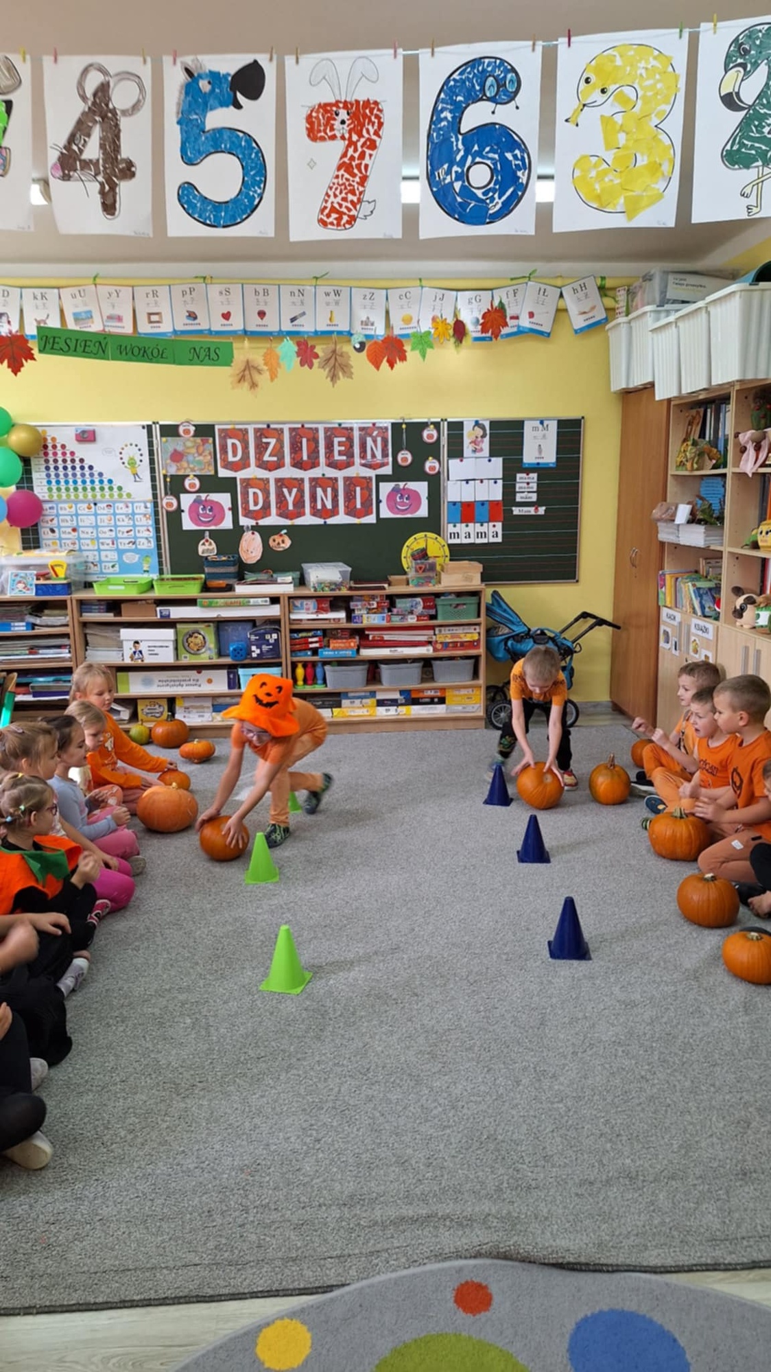 W tym dniu dzieci ubrały się na kolor pomarańczowy i przyniosły ze sobą dynie, które przez cały dzień towarzyszyły nam podczas zajęć i zabaw. Rozwiązywaliśmy zagadki, słuchaliśmy wiersza i opowiadania o dyni, dowiedzieliśmy się skąd pochodzi i opisywaliśmy jej wygląd. Poznaliśmy różne gatunki dyni i jej walory zdrowotne. Następnie przeprowadziliśmy "Burzę Mózgów", wymyślając jak najwięcej dyniowych potraw. Nie zabrakło również zabaw z udziałem dyni: dyniowe kręgle, slalom dyniowy, stanie na dyni, skoki przez dynię i wiele innych. Zaglądaliśmy również do wnętrza dyni, skąd wydobyliśmy pestki, Po wysuszeniu będzie można je zasadzić w ogrodzie lub wykorzystać jako zdrową przekąskę. Na koniec dzieci ozdabiały swoje dynie.Ten dzień był pełen wrażeń i radości.